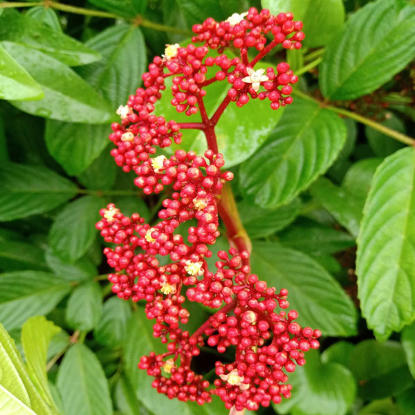 Leea guineensis is a very variable, erect or sub erect, evergreen shrub or small tree.  Tiny flowers appear in domed, many-branched, terminal clusters. Flowers are reddish-orange. Flowers may bloom throughout the year in ideal growing conditions